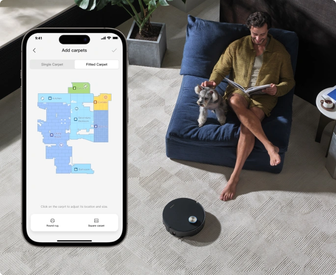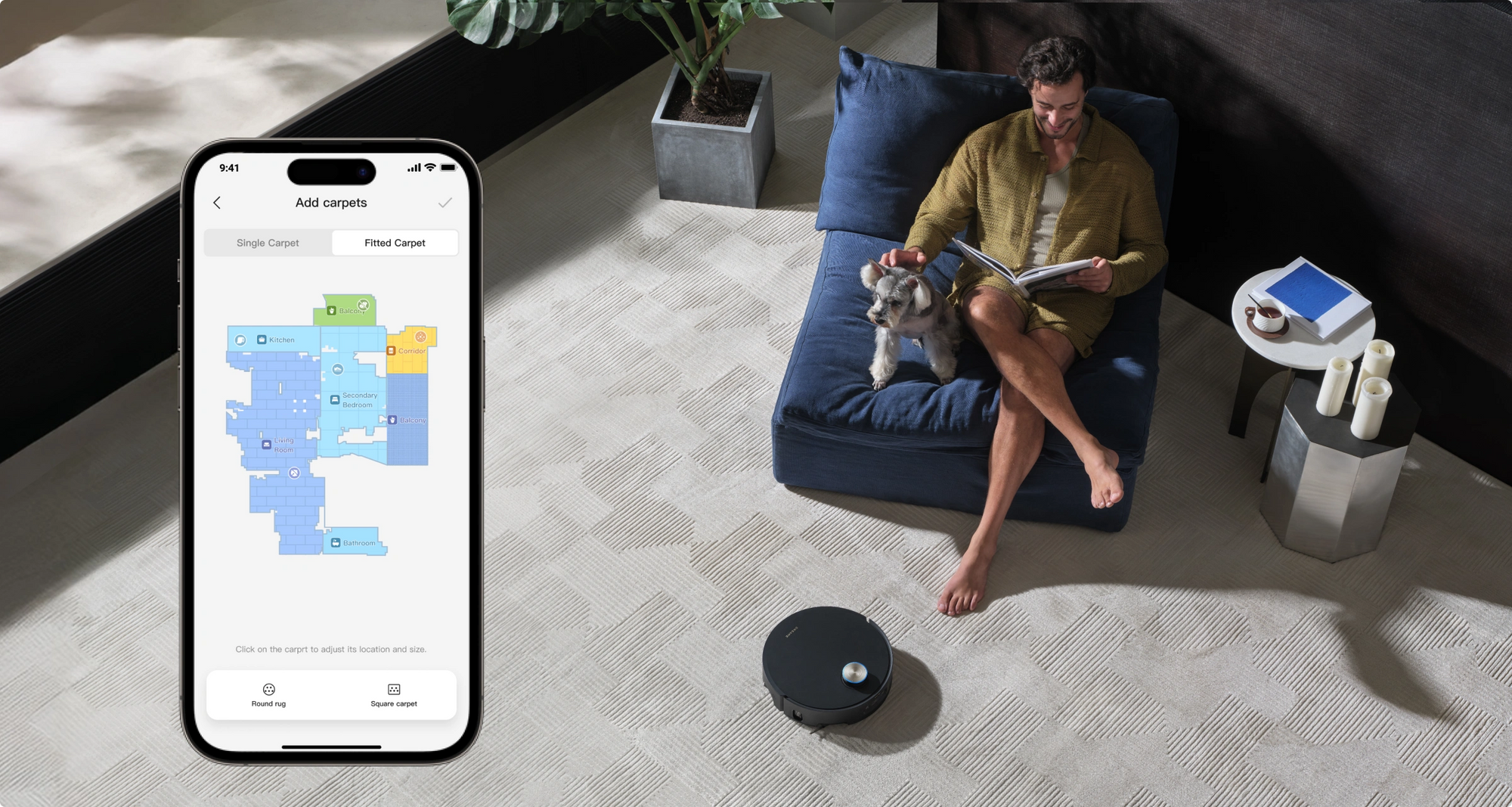 ※この機能は、幅が約8cm(3.15インチ)を超えるカーペットには推奨されません。高さのあるカーペットは湿気を帯びる恐れがあるため、高さは約3.3cm(1.18インチ)に設定してください。中毛~長毛カーペットのクリーニング設定は、クリーニングアプリから手動で有効にする必要があります。