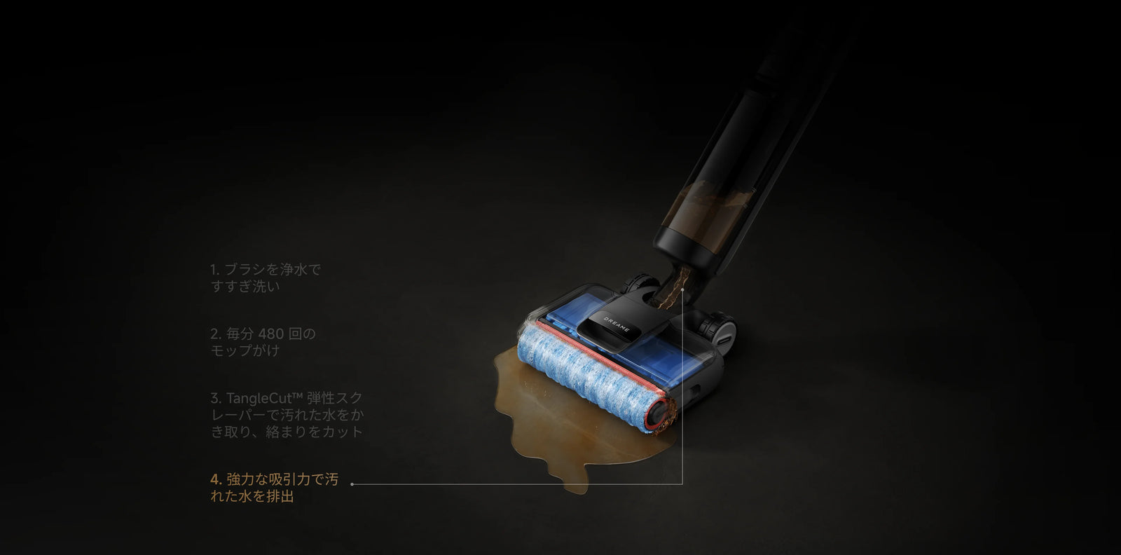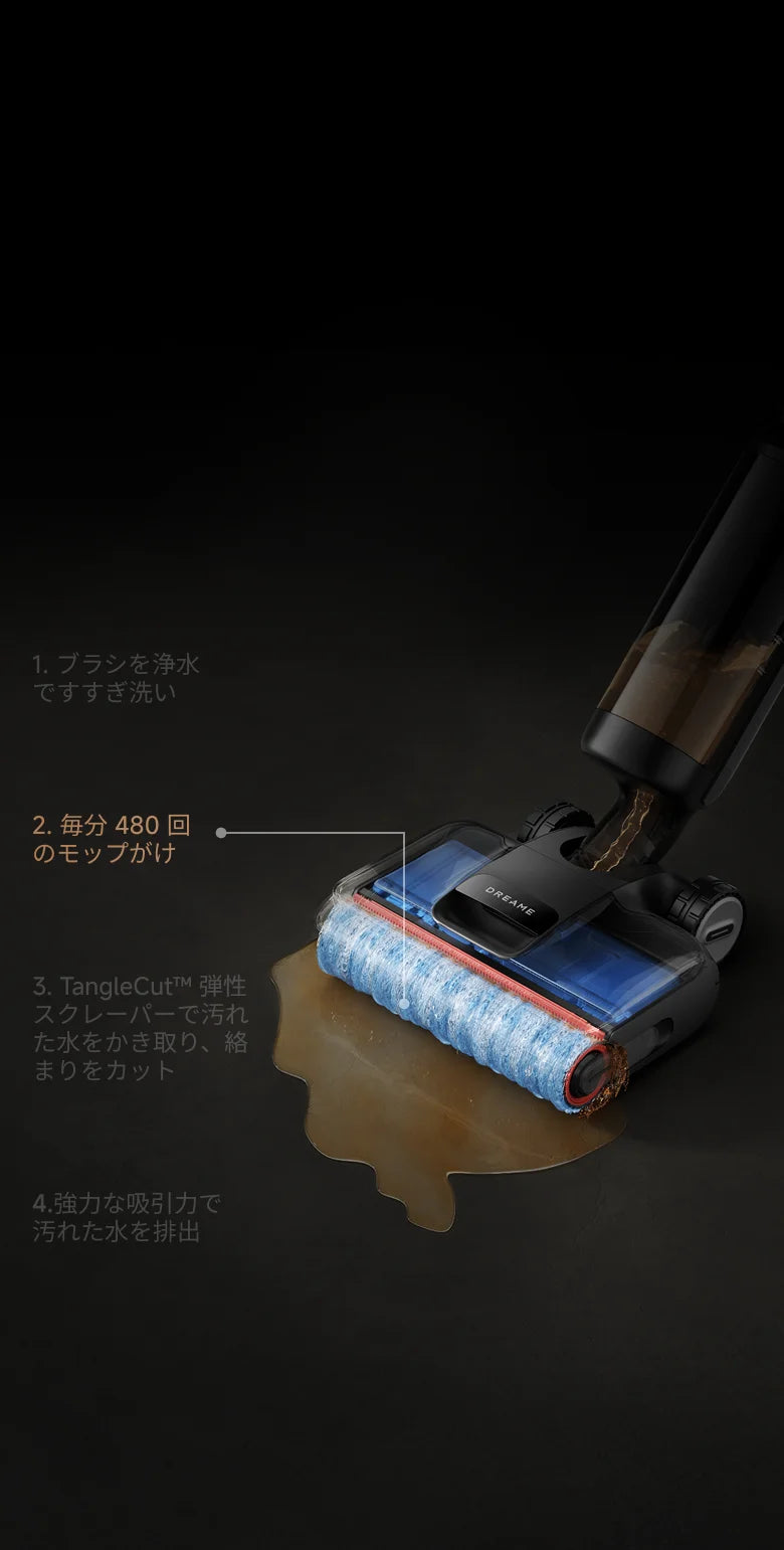H12 Pro FlexReach は、清掃のたびにブラシを浄水ですすぎ洗いし、毎分約480回の高速モップがけで汚れをしっかりかき出します。TangleCut弾性スクレーパーが汚れ水と髪の毛をかき取り、強力な吸引力で汚水タンクへ排出。自動でブラシを洗い流すので、油はねが多いキッチンや食べこぼしで汚れやすいダイニングでも、毎回「きれいなブラシ」で床掃除をスタートできます。