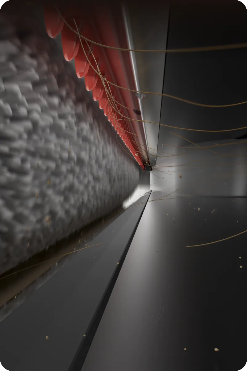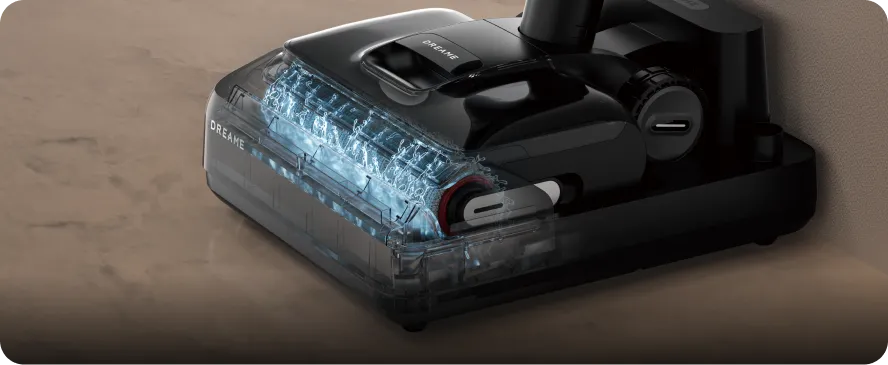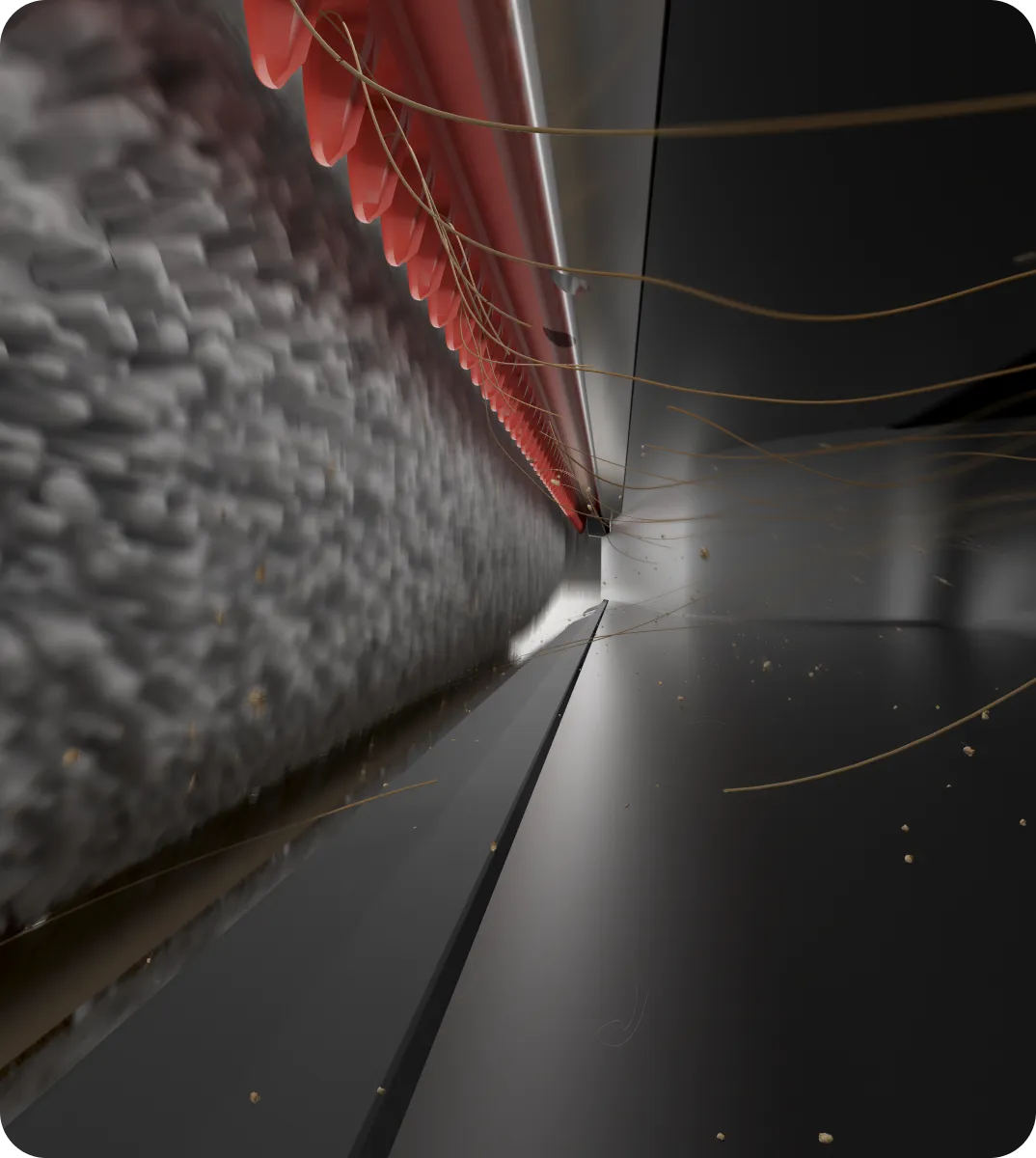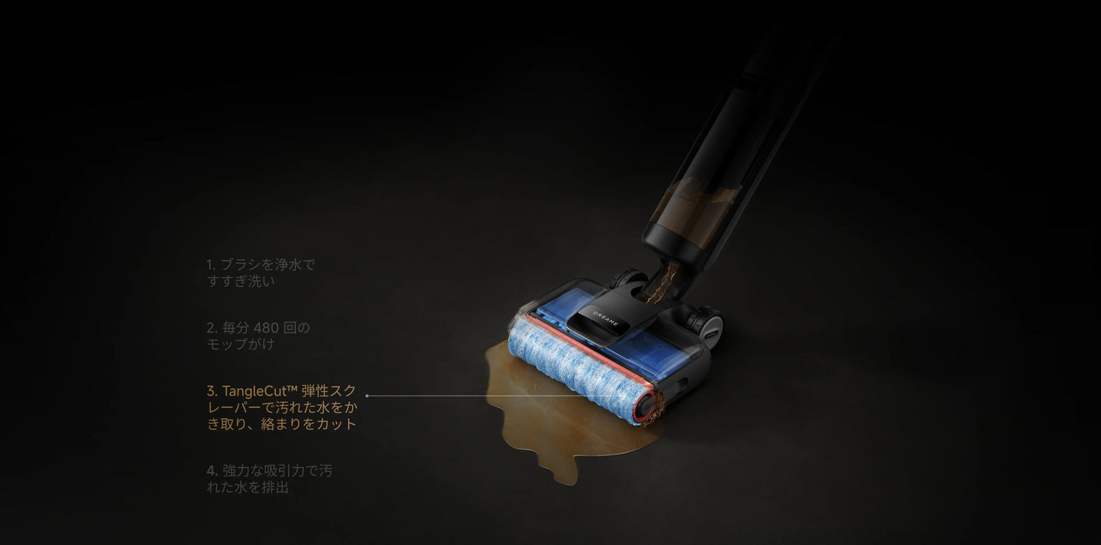 TangleCutコーム歯弾性スクレーパーとブラシの双方向回転により、ペットの毛や長い髪の毛を自動的にカット&除去。通常回転ではブラシに密着したスクレーパーが液体や汚れをしっかりかき取り、逆回転時には絡んだ毛をほどきながら汚水タンクへ送り出します。ブラシにびっしり巻き付いた髪の毛を手で引き抜いたり、ハサミで切ったりする手間が大幅に減るため、ロングヘアのご家族がいるお宅や、犬・猫などの抜け毛が多いご家庭でも、お手入れをラクに続けられます。