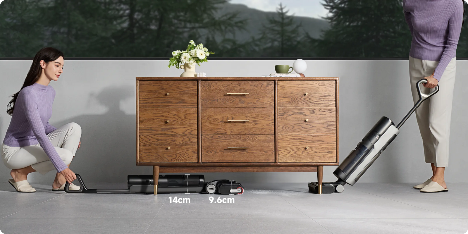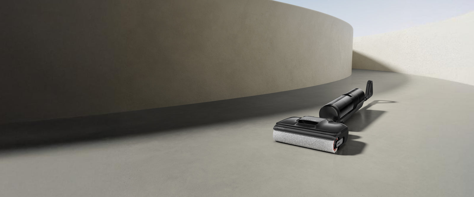 耐久性に優れた大容量バッテリー搭載で、床洗浄モードでも最大約50分の連続運転が可能。1回の充電で最大約300m²までカバーできるので、広めのLDKや一戸建て、オフィス・店舗などの大空間掃除にも対応します。大型LEDディスプレイと音声ガイドが運転状況やお手入れタイミングを分かりやすく案内し、スマートモードでは検知した汚れに応じて吸引力と吐水量を自動調整。さらに本体は180°までフルフラットに倒せるうえ、背面のオムニホイールでベッドやソファ下にもスルッと入り込めます。リビングから寝室、家具のすき間まで、家中の床掃除をストレスなく一気に終わらせたい方にぴったりです。