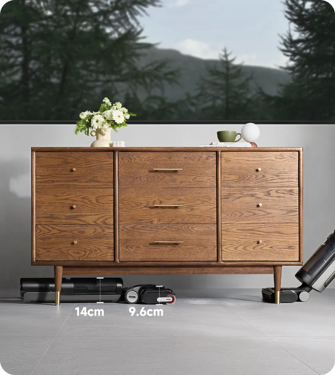 *180°、14 cm、9.6 cm:掃除機全体がわずか 14 cm のスペースに収まり、ブラシヘッドは 9.6 cm のスペースに入ります。当社の社内研究所のデータに基づきます。