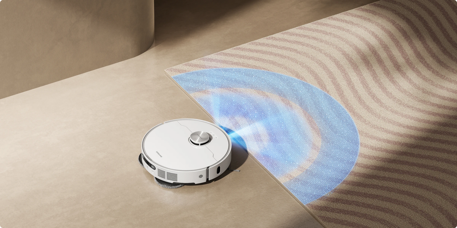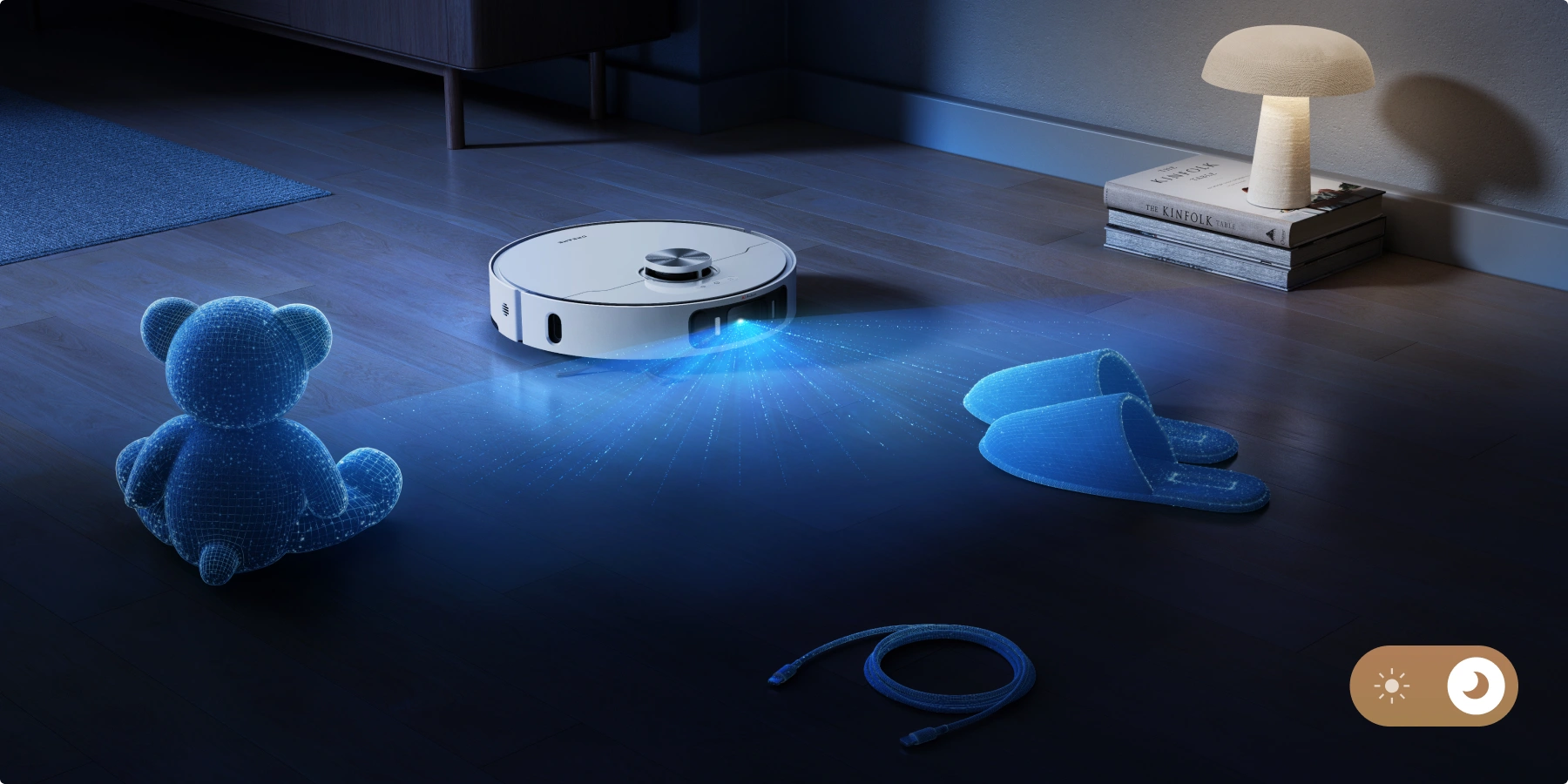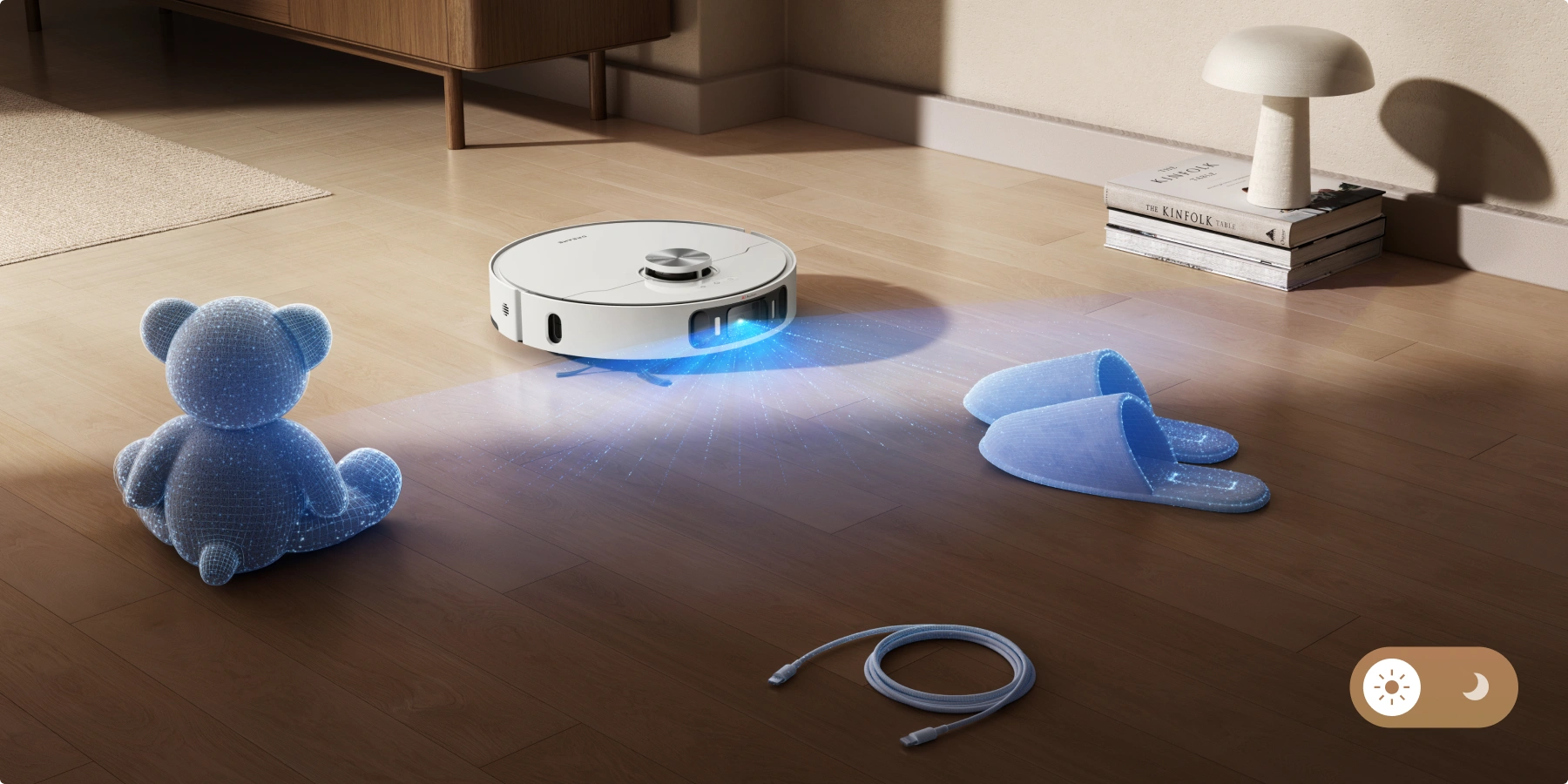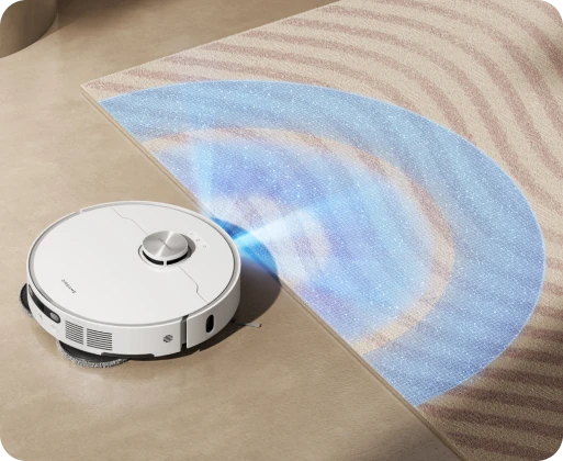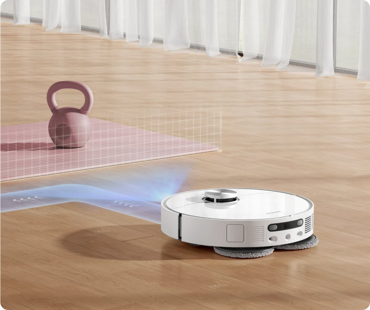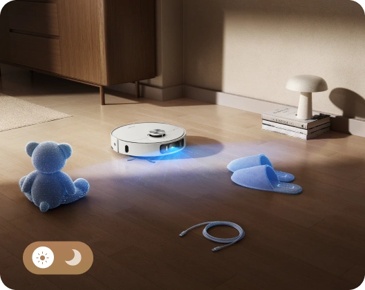 LEDライトを搭載し、夜間掃除や家具の下などの暗い場所でも、AI障害物回避精度を最大限に活用できます。また、AIと3Dイメージングシステムを備えた本機は、レーザーセンサーでは捉えにくい120種の物体をすばやく認識し、障害物を賢く回避しながら清掃します。床にモノを置き忘れていても、清掃をまかせられます。