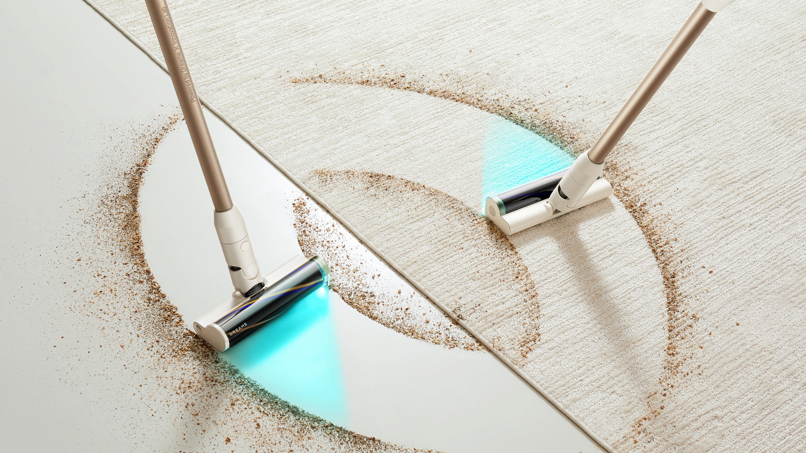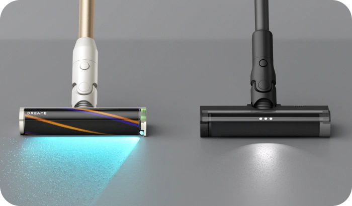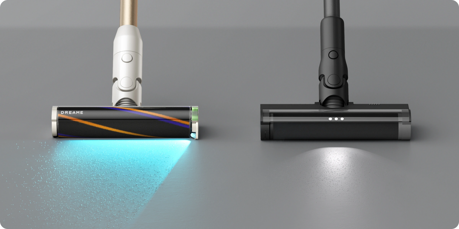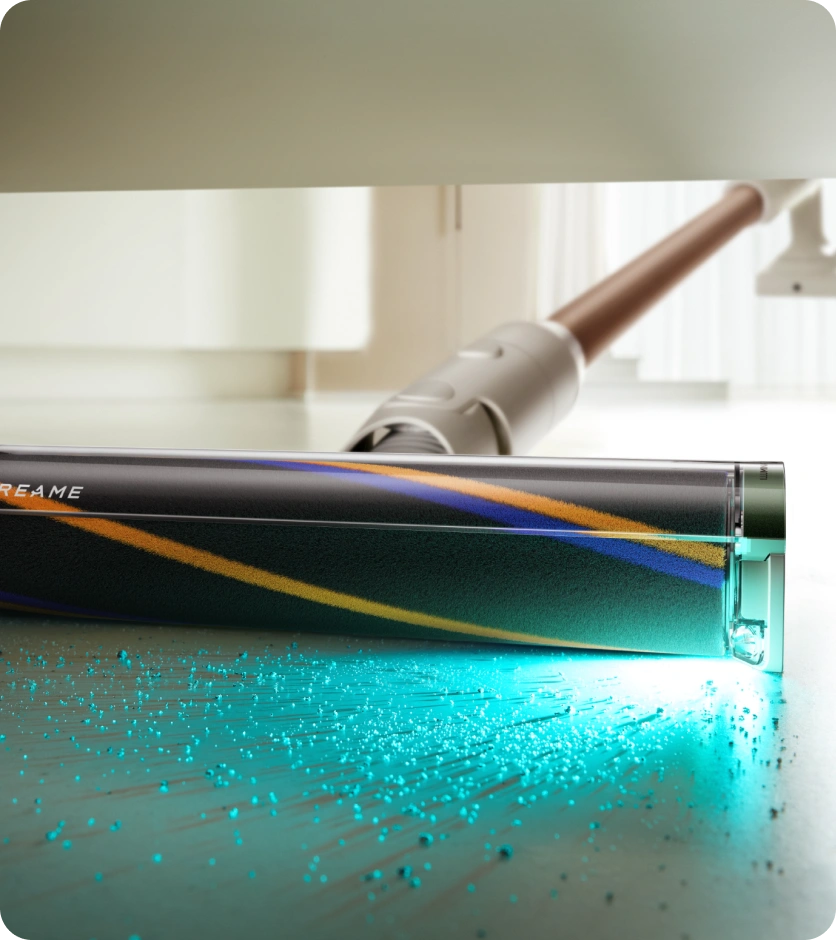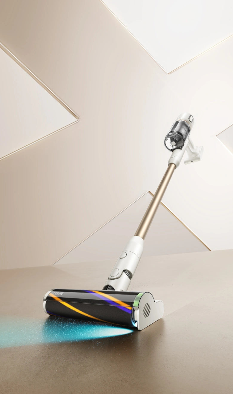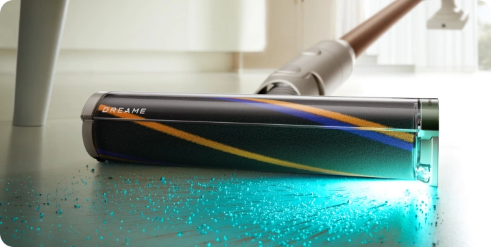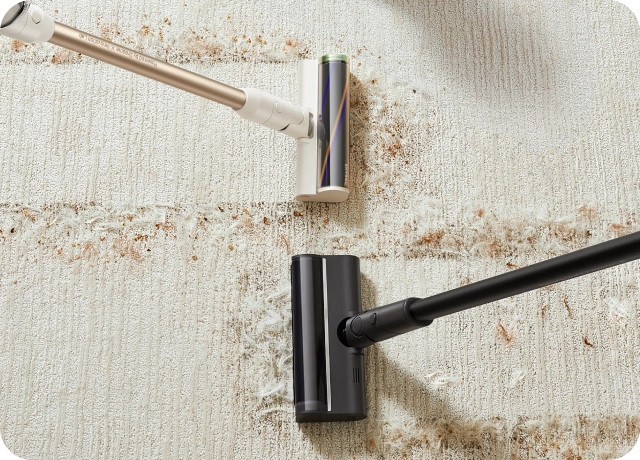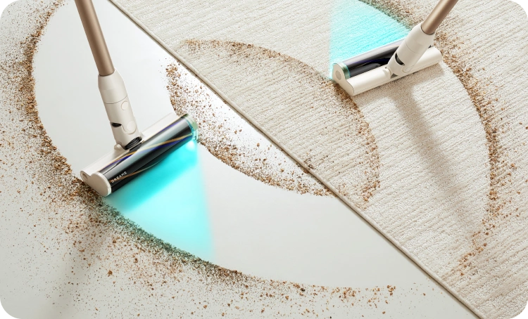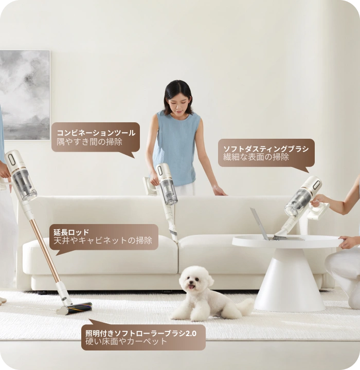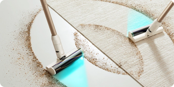 【からまりにくい照明付きブラシで、端までしっかり吸引】照明付き多用途ブラシが家具下や暗い隅のホコリを照らし出し、スパイラル構造&からまり防止設計でペットの毛もスッキリ。0mm* Clean-to-Edge設計により、壁際までしっかり吸引。3つの運転モードを搭載し、フローリング・カーペット・畳など床材に合わせて最適清掃を実現します。