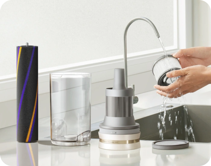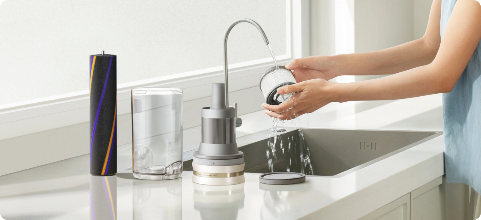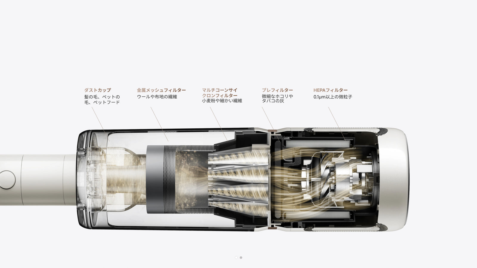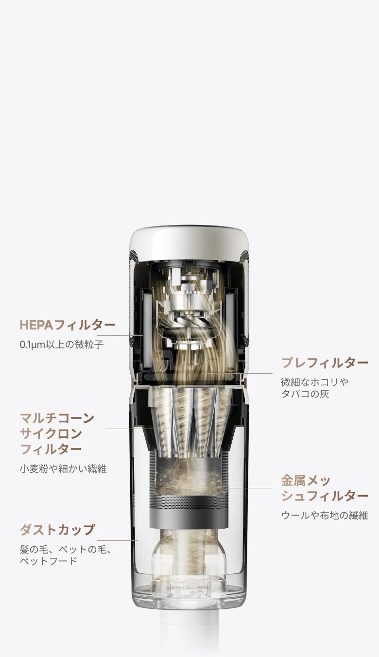 【99.99%HEPAフィルター×0.5L大容量ダストカップ】5層ろ過構造の99.99%HEPAフィルターが0.1μm*以上の微細粒子をしっかり捕集し、ハウスダスト・花粉・ペットのフケまで除去。空気までキレイに保ちます。さらに0.5Lの大容量ダストカップで、ゴミ捨て頻度を減らし衛生的に使用可能。パーツはすべて水洗い対応で、いつでも清潔。