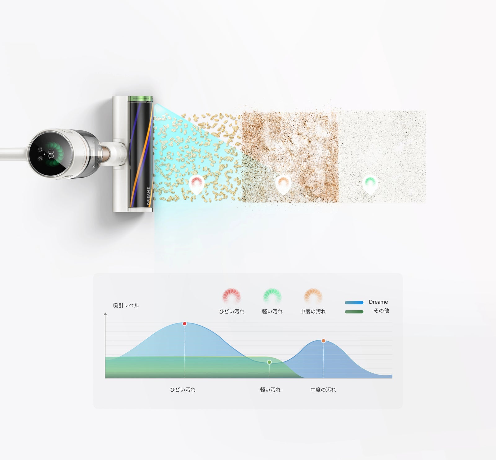 【CelesTectライト×スマートセンサー、もっと見える、もっと賢い】従来比最大16倍の可視化性能を誇るCelesTect LEDライトが、暗い場所の30μmの微細なホコリまで照らし出します。さらにスマートセンサーが汚れを自動で検知し、吸引力をリアルタイムに最適化。ホコリの多い場所ではパワフルに、少ない場所では省エネで清掃。見えない汚れも逃さない、次世代のスマート清掃を実現します。