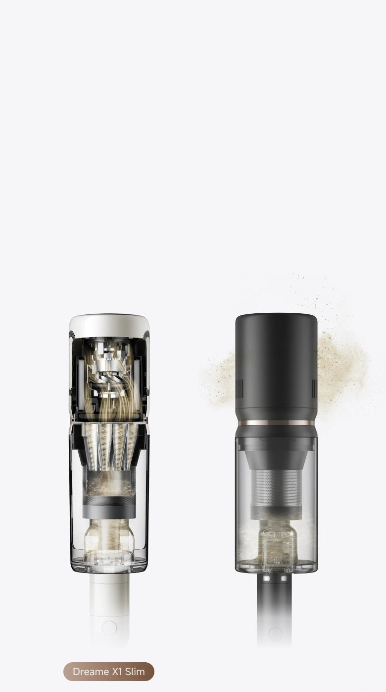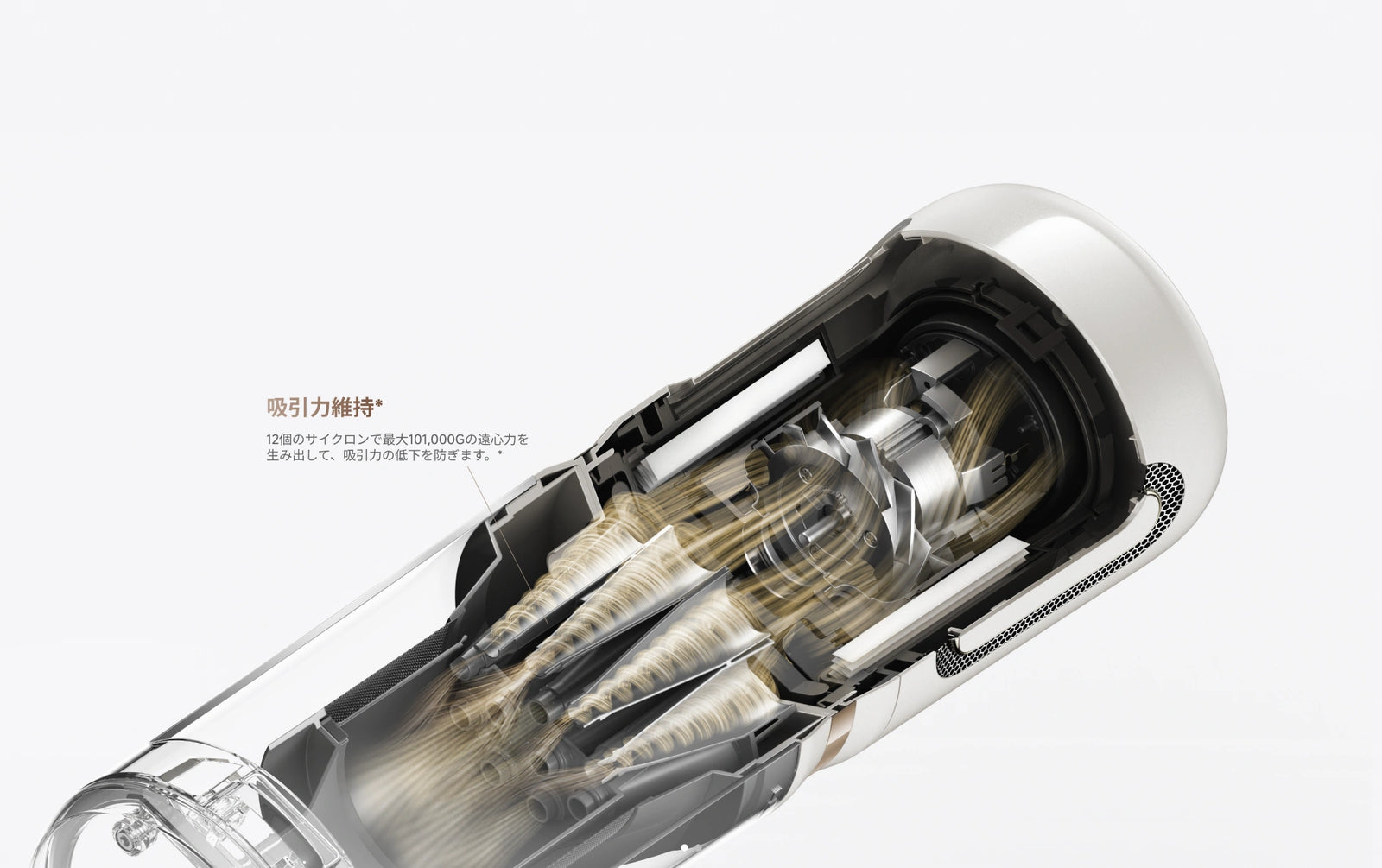 【わずか約1.4kgの軽量ボディで、最大150AWのパワフル吸引】X1 Slimは、片手で扱える約1.4kgの軽量設計ながら、最大150AWの驚異的な吸引力を発揮。高性能サイクロンシステムが最大101,000G*の遠心力でホコリを分離し、フィルター目詰まりを防止。最初から最後まで安定した吸引力を維持し、掃除のストレスを解消します。